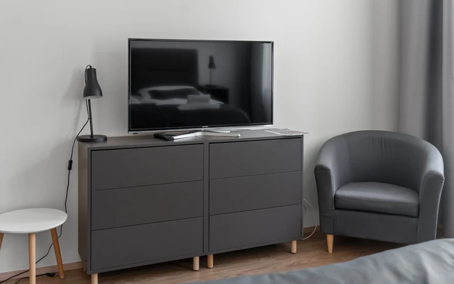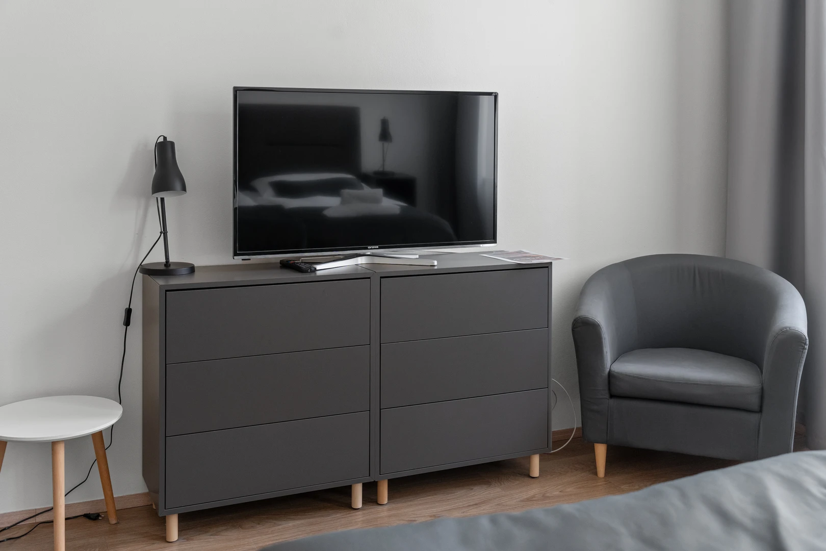 Inside there is a double bed and a sofa bed, a kitchenette and a modern bathroom with shower and toilet. For maximum guest comfort, the entire space is air-conditioned, ensuring a pleasant stay even during hot summer days.